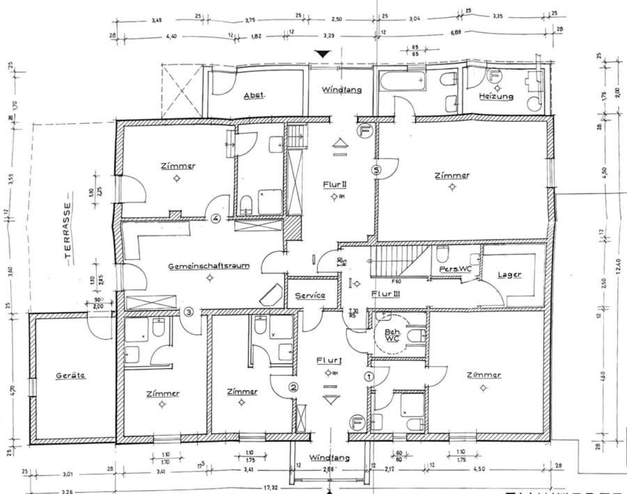 - Neun Zimmer im Obergeschoss mit einem Gemeinschaftsbad mit drei Duschen