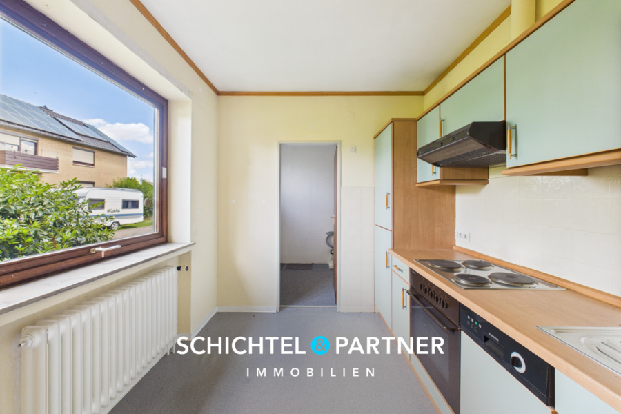 Angrenzend befindet sich die funktionale Einbauküche, die mit allen gängigen Elektrogeräten ausgestattet ist und ausreichend Platz für gemeinsames Kochen bietet. Das angrenzende zusätzliche Zimmer eignet sich flexibel als Gäste- oder Arbeitszimmer und erweitert die Nutzungsmöglichkeiten des Hauses.