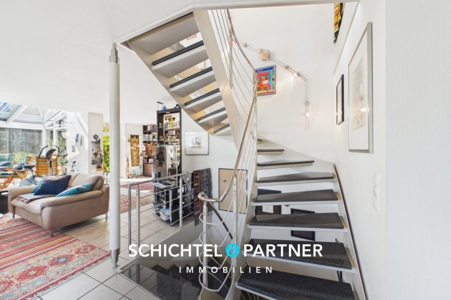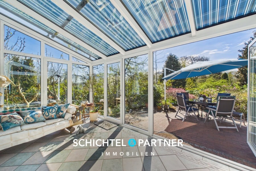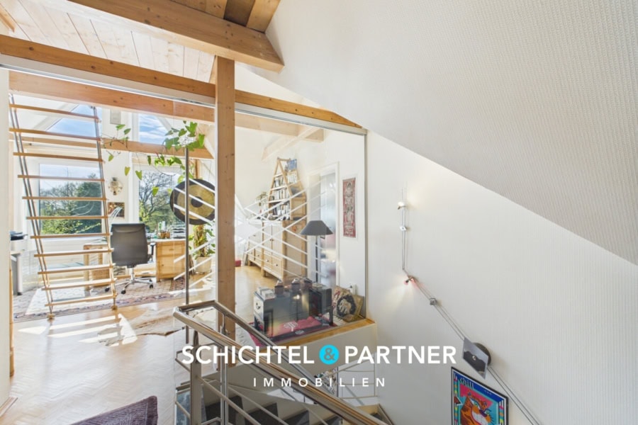 Ein besonderes Highlight ist der Wintergarten in Süd-Westausrichtung mit elektrischer Markise, der den Wohnraum spürbar erweitert. Terrasse und ausgebauter Spitzboden im Atelier-Stil eröffnen zusätzliche Nutzungsmöglichkeiten.