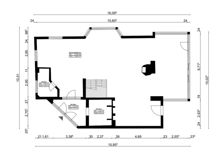 Im Inneren bildet der offen gestaltete Wohn- und Essbereich mit Kaminofen das Herzstück. Große Fensterflächen und der direkte Zugang zur Terrasse schaffen eine helle, einladende Atmosphäre und verbinden Innen- und Außenbereich auf angenehme Weise.