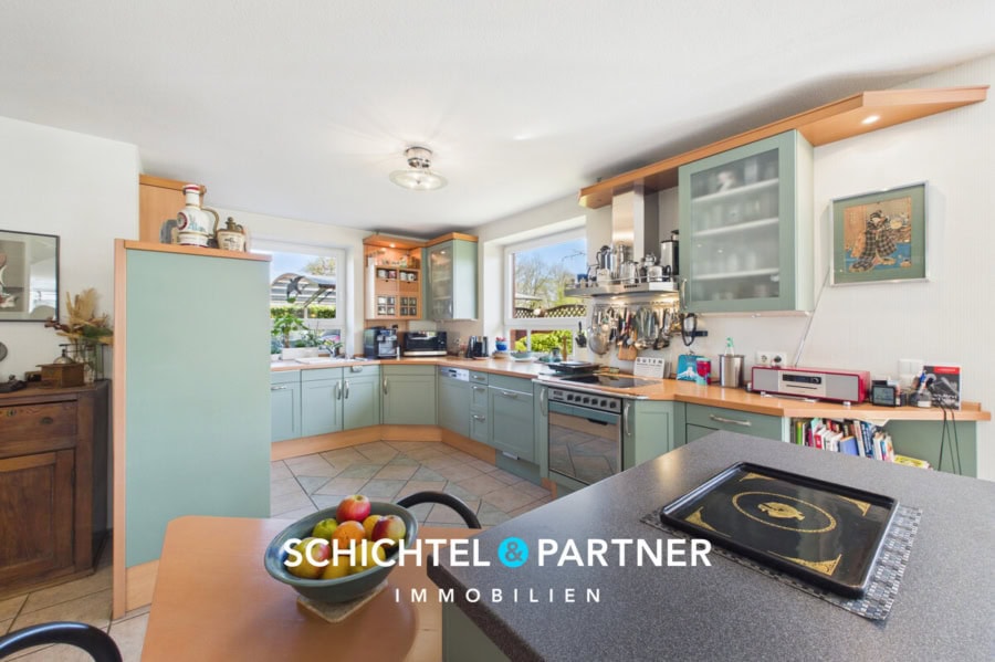 Die hochwertige SieMatic Einbauküche mit Marken-Elektrogeräten fügt sich harmonisch ein und bietet sowohl funktionale als auch optische Qualität. Im Obergeschoss befindet sich ein modern gefliestes Tageslicht-Vollbad, ergänzt durch ein Gäste-Bad mit Fenster und Dusche im Erdgeschoss.