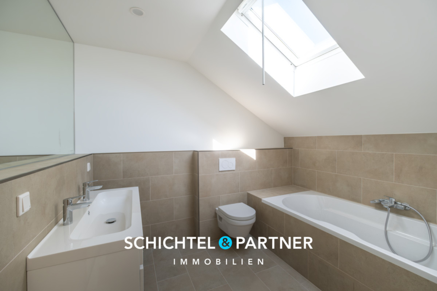 Auf jeder Etage finden Sie eine kleine Wellnessoase: Im Erdgeschoss ein Gäste-WC mit Fenster sowie ein Duschbad mit Doppelwaschbecken – beide in Greige gefliest. Im Obergeschoss lädt ein ebenfalls in Greige gestaltetes Wannenbad mit Velux-Fenster zum Entspannen ein und bietet die Möglichkeit, unabhängig oder gemeinsam mit Ihren Liebsten ein Bad zu nehmen.