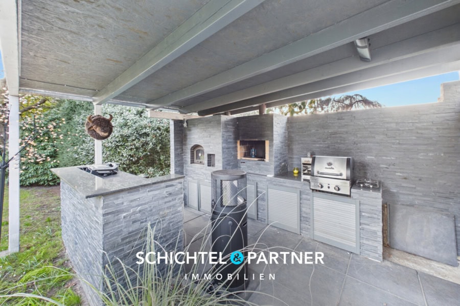 Im Außenbereich lädt die frisch gepflasterte Terrasse mit Süd-Ausrichtung und elektrischer Markise zum Verweilen ein. Das eigentliche Highlight bildet jedoch die überdachte Außenküche mit gemauertem Pizzaofen, Gasanschluss, Grill und Kühlschrank. Nach Vereinbarung sind die verbauten Geräte bereits im Kaufpreis enthalten.