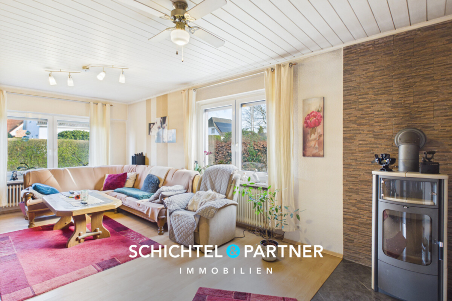 Beim Betreten fällt sofort das weitläufige Wohnzimmer ins Auge. Dank großer Fensterfronten dringt viel Tageslicht ein und schafft eine helle, freundliche Atmosphäre. Ein besonderes Highlight ist der neue Kaminofen von ca. 2026, der Wärme und optische Akzente verbindet.