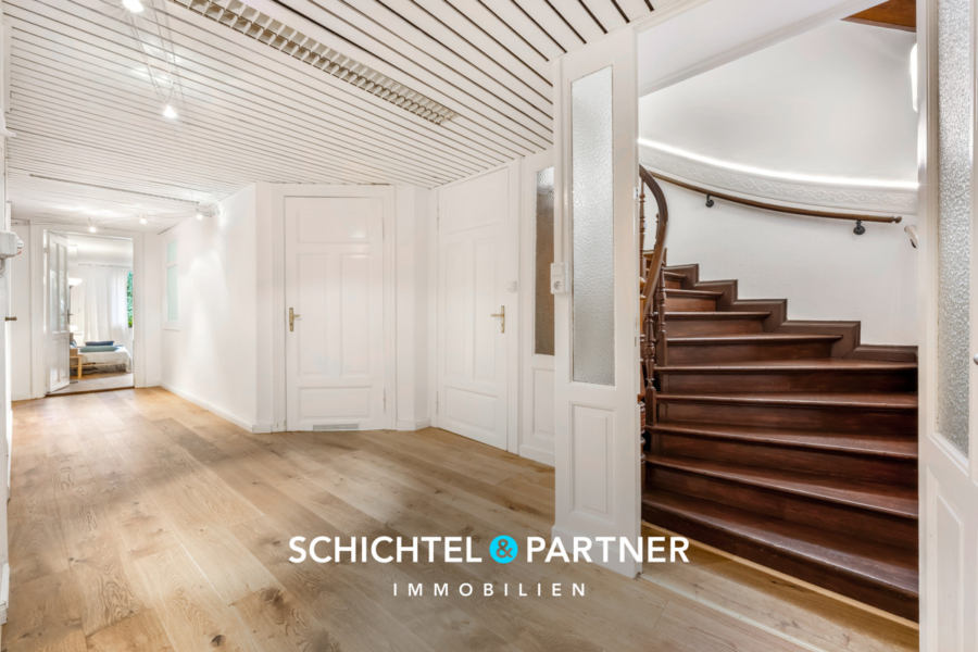 Die mit kunstvollem Stuck verzierte Außenfassade verleiht der Immobilie neben der Veranda vor der majestätischen Rundbogentür seinen unverwechselbaren Charme und beim Betreten des Hauses werden Sie von einem eindrucksvollen Windfang aus echtem Marmor empfangen, der den Weg in die lichtdurchfluteten Räume ebnet. Breite Treppenhäuser mit eleganten Handläufen aus Holz und ein Oberlicht dürfen hier nicht fehlen.