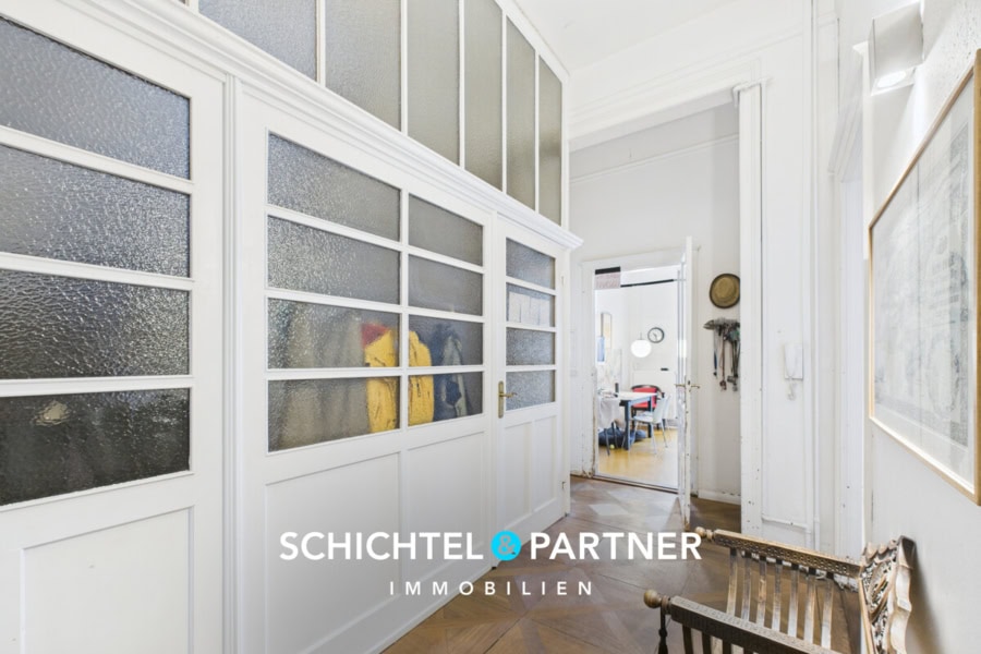 Beim Betreten wird man sofort von der Großzügigkeit klassischer Altbauarchitektur empfangen. Hohe Decken und weitläufige Räume schaffen ein offenes, lichtdurchflutetes Wohngefühl. Die Böden bestehen aus einer Kombination aus Echtholzparkett, sorgfältig aufgearbeiteten Holzdielen und funktionalen Fliesen in Küchen und Bädern. Original erhaltene Türen und Zargen bewahren den historischen Charakter, während die doppelt verglasten Holzfenster von ca. 2006 die Energieeffizienz verbessern, ohne den Stil zu beeinträchtigen. So entsteht eine harmonische Verbindung von traditioneller Bauweise und modernen Wohnansprüchen.