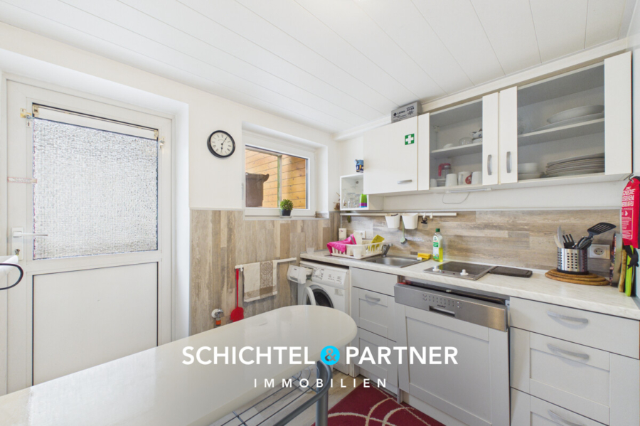 Bodenbeläge aus Laminat, Vinyl und Fliesen sorgen für pflegeleichte und langlebige Oberflächen. Die zweifach verglasten Kunststofffenster stammen von ca. 1985, teilweise sind elektrische Rollläden installiert, die zusätzlichen Komfort und Privatsphäre ermöglichen. Die effiziente Gas-Zentralheizung wurde ca. 2013 erneuert, und robuste Kupferrohre gewährleisten eine zuverlässige Wasserführung.