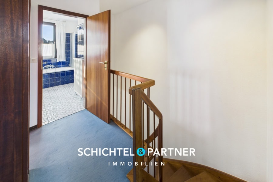 Das Obergeschoss überzeugt mit lichtdurchfluteten, optimal geschnittenen Schlafzimmern, die vielfältige Einrichtungsmöglichkeiten eröffnen. Ein zusätzliches Gäste- oder Arbeitszimmer steht für flexible Nutzung bereit und kann als Homeoffice, Kinderzimmer oder Hobbyraum fungieren. Das blau geflieste Tageslicht-Vollbad präsentiert sich gepflegt und geräumig.