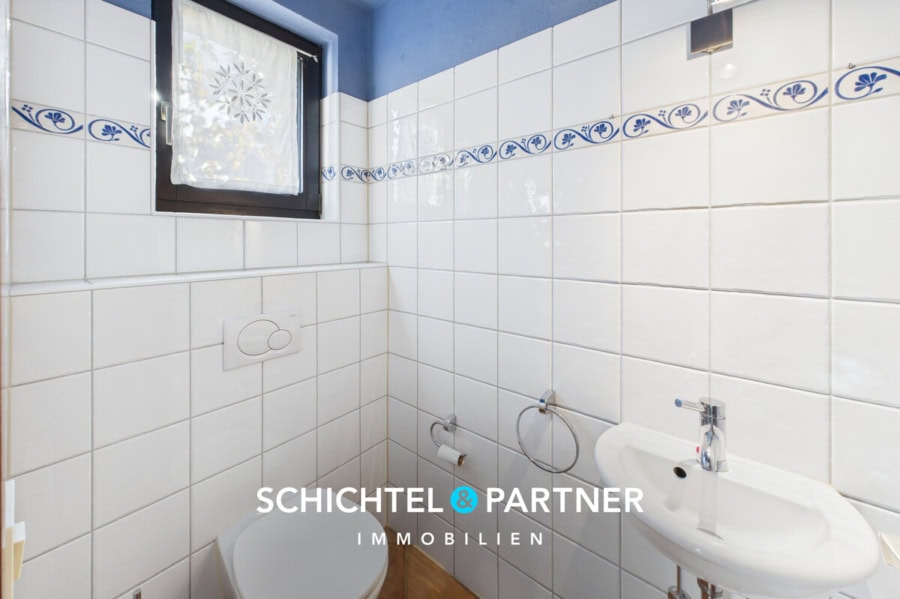 Die praktische Einbauküche mit Durchreiche zum Wohnbereich ist funktional gestaltet und lädt zum gemeinsamen Kochen ein. Ergänzt wird diese Ebene durch ein Gäste-WC mit Fenster, das Komfort und Alltagstauglichkeit bietet.