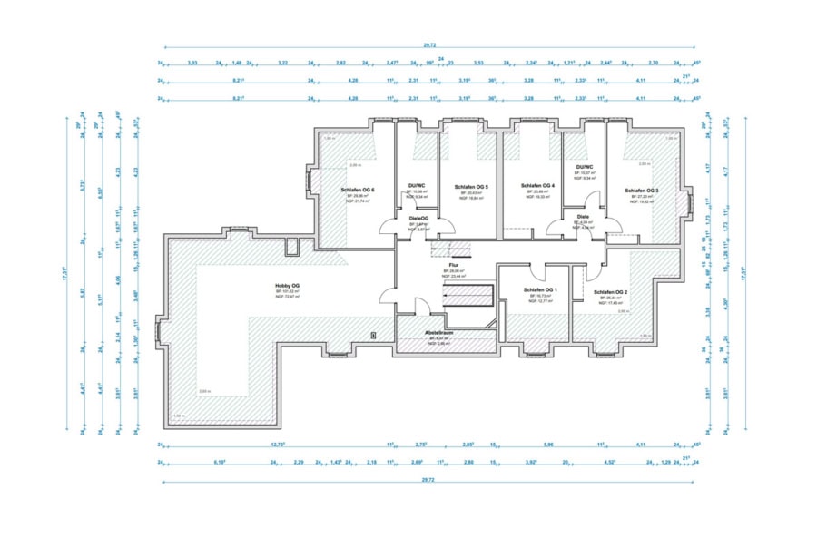 - Zwei Schlafbereiche im Obergeschoss mit jeweils einem Duschbad und zusätzlicher Ankleide