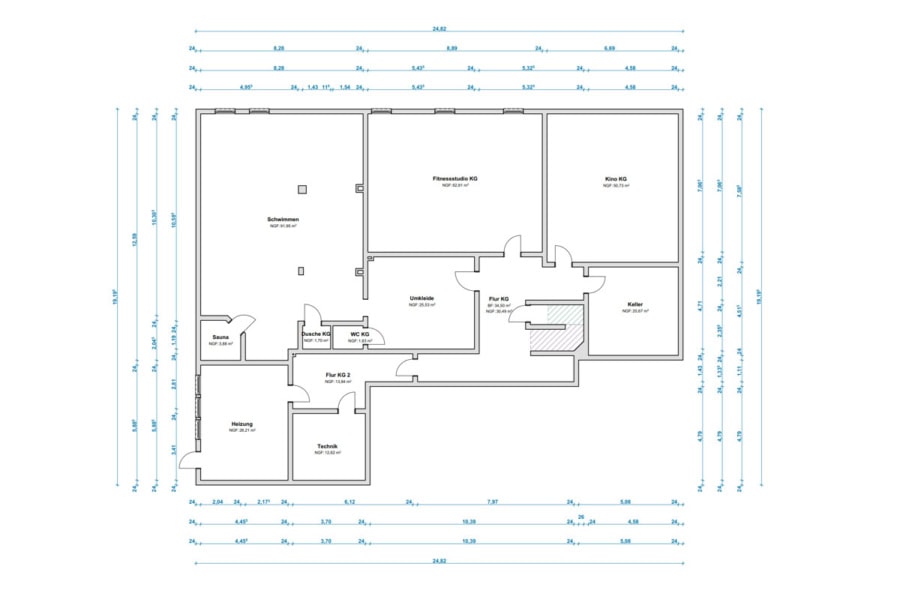Als Herzstück dieser Villa gilt das Kellergeschoss, das durch Deckenhöhen von bis zu ca. 3,50 m eher einem Freizeitbereich ähnelt. Hier erwarten Sie ein Fitnessraum, ein Heimkino für Entertainment sowie ein Wellnessbereich. Dieser beeindruckt mit einer Sauna-Vorrichtung, hochwertigen Sanitäranlagen und einem Pool, der ca. 2,20 m tief ist, sich über 25 °C erwärmen lässt und mit einer Gegenstromanlage zum Schwimmen versehen wurde.