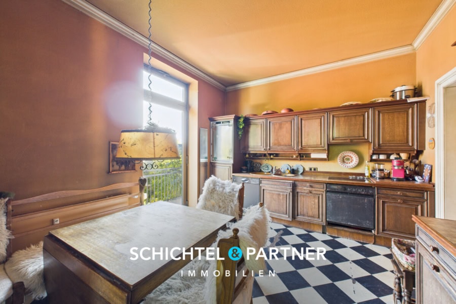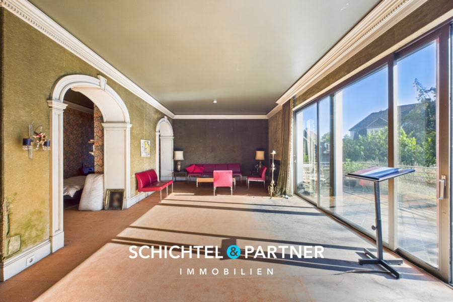 Große Fensterfronten sorgen für ein lichtdurchflutetes Raumgefühl und die insgesamt rund 13 Zimmer sind gut geschnitten und bieten vielfältige Nutzungsmöglichkeiten – vom Familienwohnsitz über Mehrgenerationenwohnen bis hin zur teilgewerblichen Nutzung.