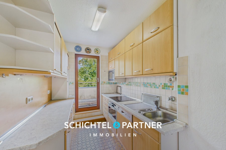 Die funktionstüchtige und praktische Einbauküche inklusive Elektrogeräte ist gepflegt und hervorragend an den Raum angepasst. Das braun geflieste, innenliegende Vollbad präsentiert sich funktional mit motorisierter Lüftung und fügt sich perfekt in das Gesamtbild. Die Fliesen sind hochwertig und nicht beschädigt, sodass sie sich bei Bedarf problemlos neu beschichten oder lackieren lassen.