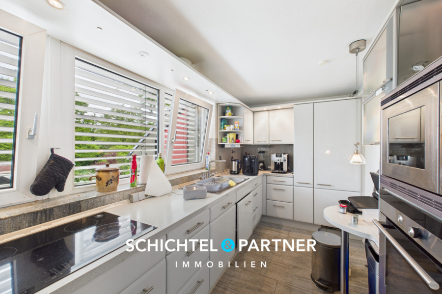 Die Küche ist funktional ausgestattet und beinhaltet sämtliche Elektrogeräte. Ein praktischer Abstellraum schließt sich hier direkt an und sorgt für zusätzlichen Stauraum.