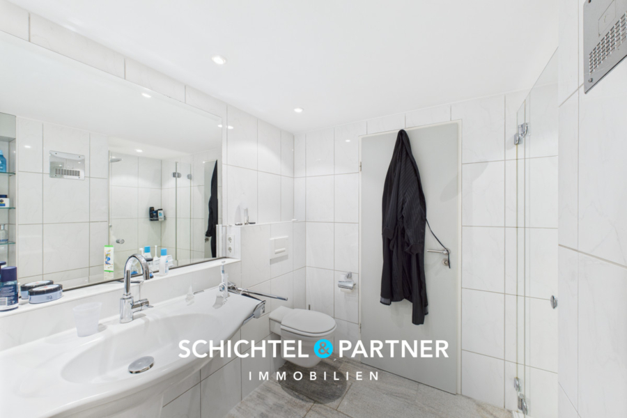 Im weiß gefliesten Vollbad werden mit einer ebenerdigen Dusche und einer Badewanne keine Wünsche offen gelassen. Ein Gäste-WC befindet sich im Eingangsbereich der Wohnung und ergänzt das Raumangebot optimal