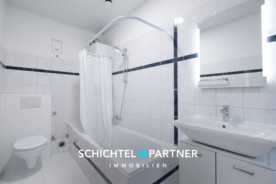 Auch das weiß geflieste Badezimmer präsentiert sich gepflegt und funktional. Eine neue Gasetagenheizung (ca. 2021), ein digitales Thermostat sowie die erneuerte Elektrik mit FI-Schutzschalter sorgen für zeitgemäßen technischen Komfort.