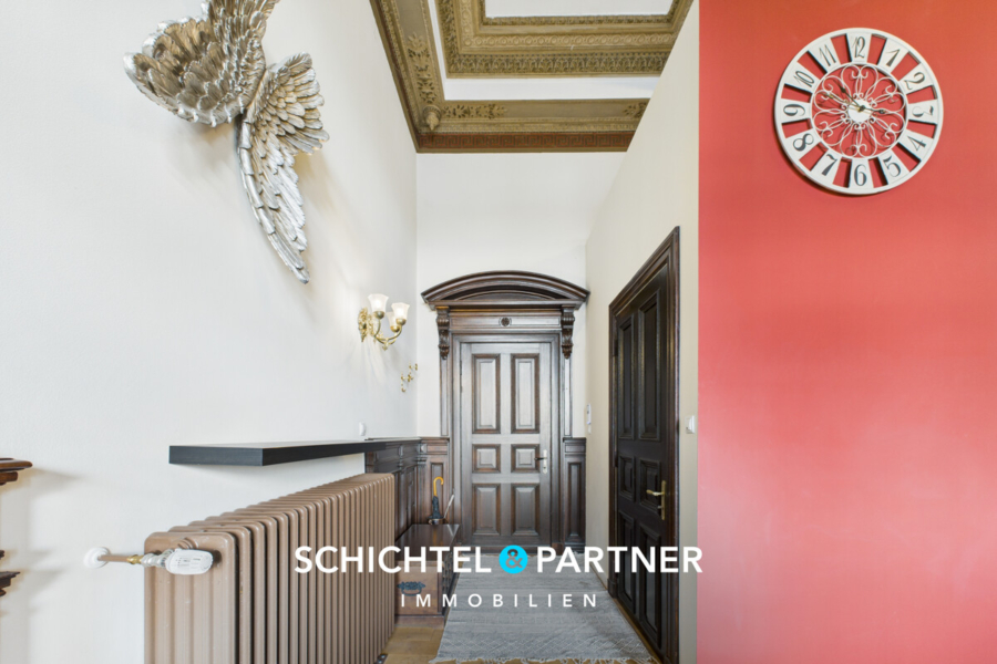 In die rund 150 m² Wohnfläche, mit spektakulären Deckenhöhen von bis zu ca. 5 m, kunstvollen Verzierungen und originalen Kassettendecken, verliebt man sich sofort.