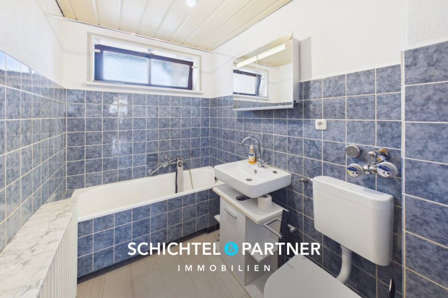 - Blau-weiß gefliestes Tageslicht-Vollbad